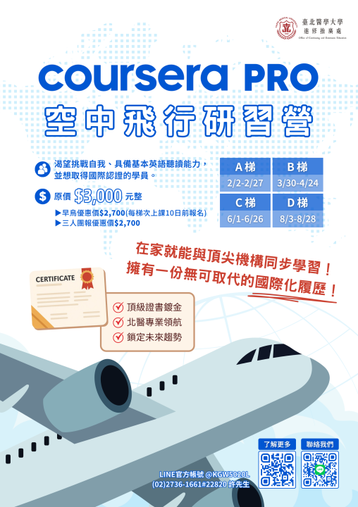 說明: 一、臺北醫學大學為鼓勵高中學子於寒假期間參與多元學習,將於115年 2月2日起辦理【Coursera Pro空中飛行研習課程】4梯 次。