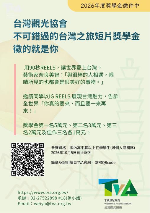 一、財團法人台灣觀光協會(下稱本會)自1956年成立至今70 年,為台灣最具規模、歷史最悠久的觀光推廣單位。歷年 赴全世界推廣台灣觀光,吸引國際旅客來台旅遊,並主辦 台灣美食展及ITF台灣國際旅展,將台灣的文化、美食、觀 光傳遞到全球各角落。 二、為鼓勵學生發掘台灣景點,讓世界旅人看到台灣,本會設 立「不可錯過的台灣之旅短片獎學金」。開辦首屆成效良 好,超過200件短片作品參賽,參賽者包含本土學子,更有 來自緬甸、印尼、越南等地外籍生,以異國視角注入國際 元素,證明台灣的美具備跨越國界的力量。本(2026)年度 持續辦理,邀請貴校學生用60-90秒IG REELS 短片參賽, 展現台灣魅力讓世界愛上台灣。簡章如附件1。三、獲獎者將於「台灣觀光協會捐贈人年會」中接受表揚,並 頒發獎金及獎狀,本活動歷年邀請行政院、交通部、觀光 署、各國代表處、航空公司、飯店、旅行業、學校教授數 百人共襄盛舉,將可提升貴校名聲及學生之經歷。 四、懇請公告電子海報如附件2,敬邀貴校同學於2026年10月5 日前報名申請,共同點亮台灣觀光。