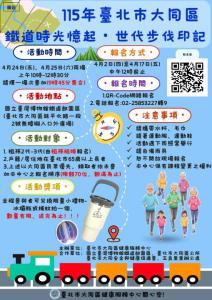 一、依臺北市政府衛生局115年營造高齡友善社區計畫辦理。 二、為促進長者走出戶外、倡導敬老氛圍、增進世代融合,本 中心於115年4月24日(星期五)、4月25日(星期六),辦 理「鐵道時光憶起‧世代步伐印記」活動,請貴校運用多 元管道(公布欄、電子媒體、社群網站、部落格等),協 助推廣宣導,並鼓勵貴校同仁、學生及家長踴躍參加。 (一)鐵道時光憶起‧世代步伐印記活動 1、招生對象:限額70名,額滿為止 (1)祖孫2代-3代「組隊參加」,長者作為小隊長攜兒 女或祖孫一起報名。 (2)臺北市65歲以上長者(以弱勢、福利戶優先)。 2、活動時間:115年4月24日(星期五)、4月25日(星期六),上午10-12:30(9:50前集合),請擇1場次參 加。 3、活動地點:國立臺灣博物館鐵道部園區(臺北市大同 區延平北路1段2號無障礙入口外廣場)。 4、報名方式:即日起至4月17日中午12點止,採QR-CODE 網路及電話報名。 三、檢附鐵道時光憶起‧世代步伐印記活動活動文宣1份(如附 件)。