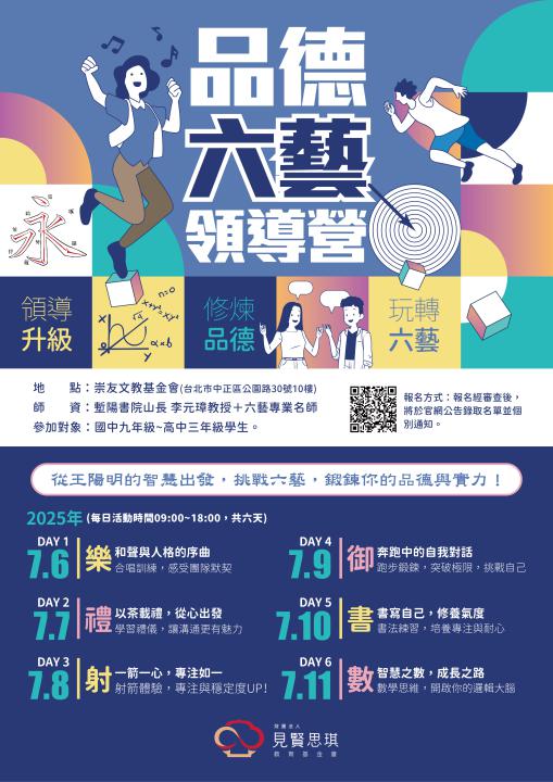 一、為提升青少年品德教育與多元能力發展,本基金會特舉辦暑期「青少年六藝領導營」,採體驗式學習模式,透過現代六藝(禮、樂、射、御、書、數)之室內實作及戶外活動,並結合王陽明經典人格精神的學習,啟發學生自我探索與成長,培養其責任感、團隊合作及問題解決能力。
