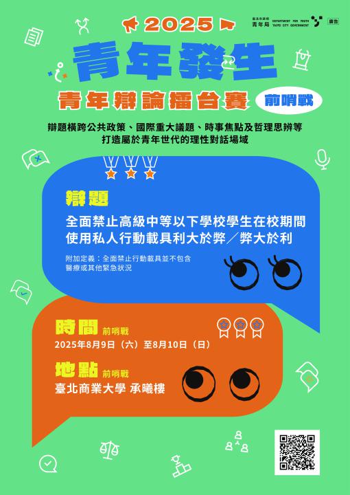 並培養議題分析、理性思辯與溝通表達等公民能力素養,本局特辦理「青年發生」2025青年辯論擂台賽。