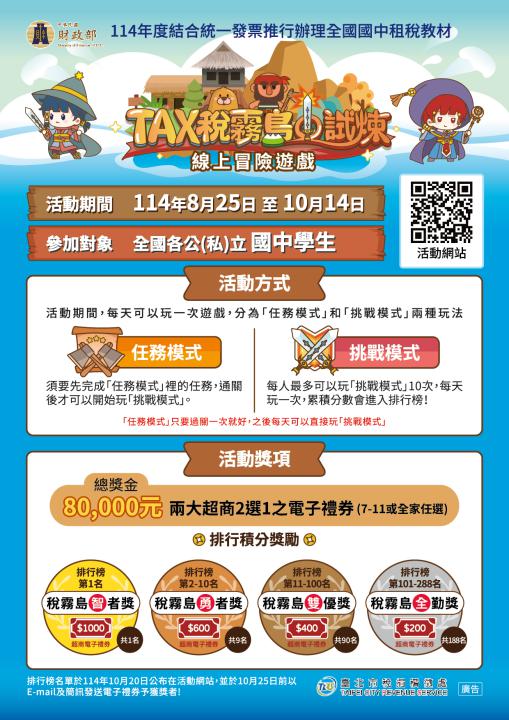 (三)內容:分為「任務模式」與「挑戰模式」兩種玩法,活動詳情請上活動網站(https://www.gotax.tw/tax2025/)或「北市稅處」粉絲專頁(https://www.facebook. com/tpctax/?locale=zh_TW)查詢。