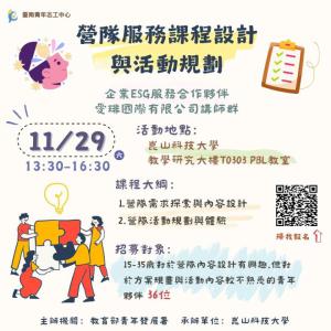 五、主辦機關:教育部青年發展署;承辦單位:青年發展署臺 南青年志工中心(崑山科技大學)。 六、檢附課程資料及宣傳圖檔。
