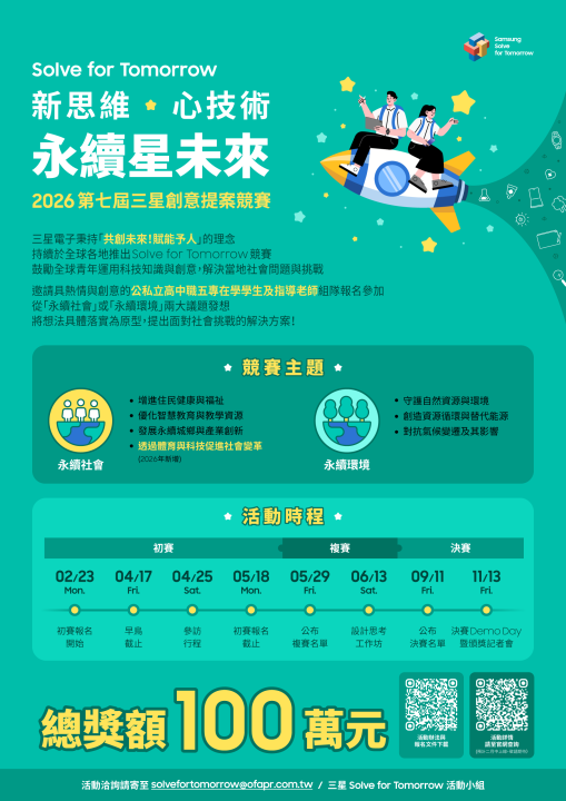 三、檢附「2026第七屆三星創意提案競賽」簡章及宣傳海報各1 份,倘有未盡事宜,如競賽報名及作品收件相關問題等, 請逕洽三星Solve for Tomorrow活動小組,信箱: Solvefortomorrow@ofapr.com.tw。