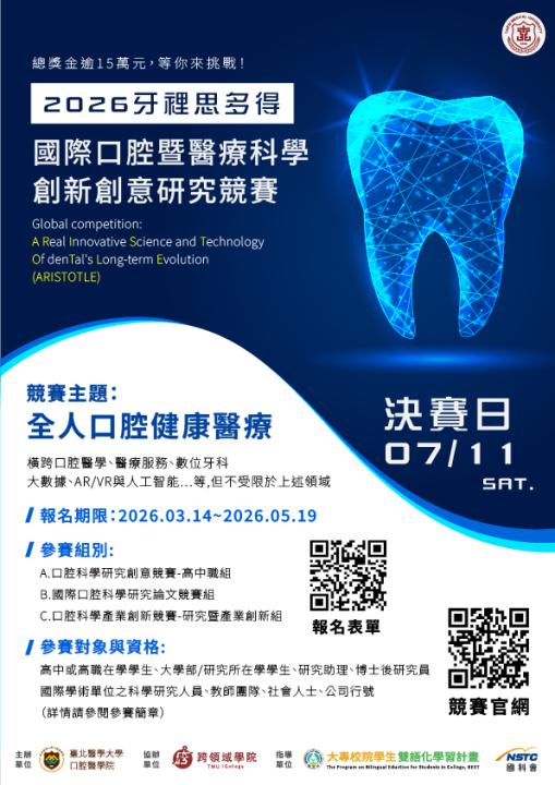 一、旨揭競賽係本校口腔醫學院主辦,以「全齡智慧口腔醫學」為主軸,內容橫跨口腔醫學、醫療服務、數位牙科、 大數據、AR/VR與人工智能…等,但不受限於上述領域,請參賽者發揮創意,提出各種創意構想。