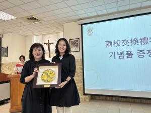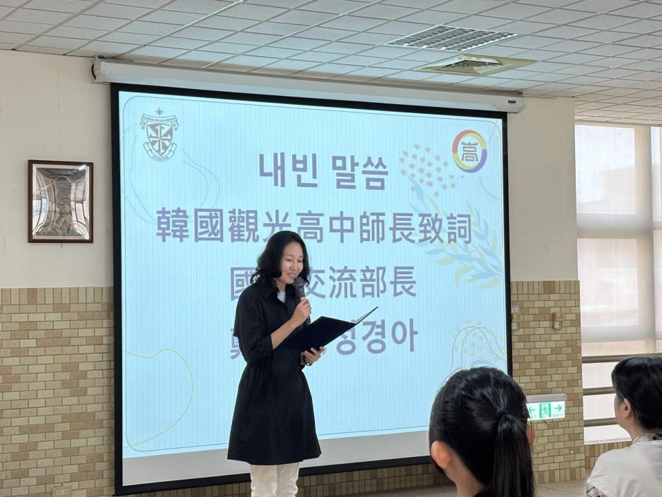 韓國觀光中學鄭敬娥部長亦致詞回應,感謝靜修中學的熱情接待。接著由雙方學生代表發言,靜修中學馮凱琪同學以英文致詞、黃鈺潔同學以中文表達歡迎之意;韓國學生代表崔慜姣則分享來臺交流的期待與喜悅,展現青年學子跨文化溝通的自信與活力。
