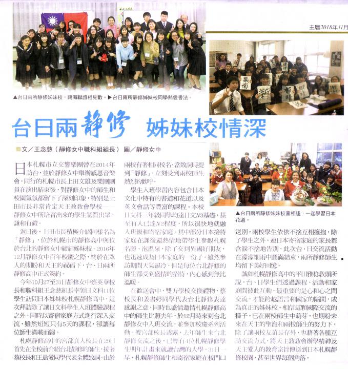 今(2018)年10月27至31日靜修女中蔡英華校長和職科王念慈組長率領日文科11位學生訪問日本姊妹校札幌靜修高中,這次拜訪除了讓日文科學生入班體驗課程之外,同時以寄宿家庭方式進行深入交流,雖然短短只有五天的課程,卻讓每位師生滿載而歸。