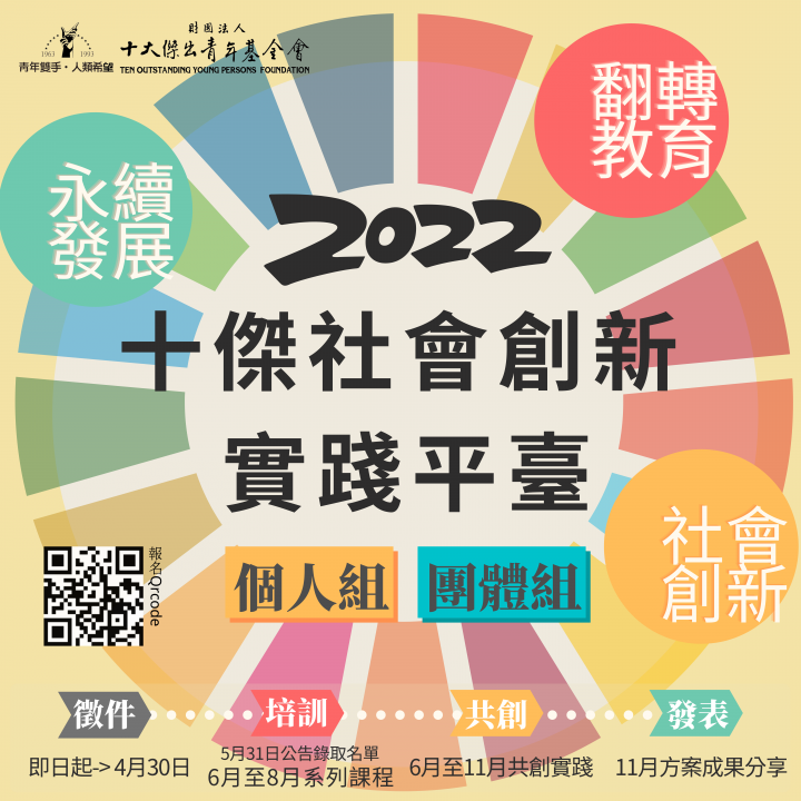 二、2022年「十傑社會創新實踐平臺計畫」以「永續發展」、 「翻轉教育」、「社會創新」三大面向作為本年度徵件主題,鼓勵青年提出具創新、影響力的社會實踐方案並以具 體行動回應並嘗試解決各種社會問題。