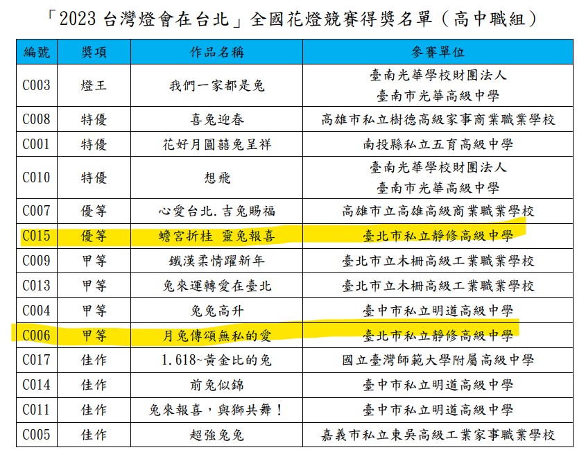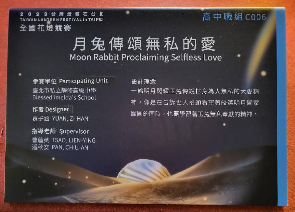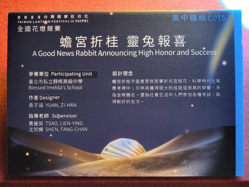 恭喜本校高一愛班袁子涵同學,精心製作的兩組花燈於全國花燈競賽中榮獲獎項